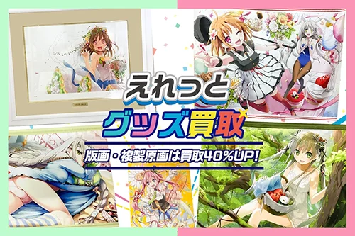 イラストレーターえれっとのグッズを買取。挿絵を担当したラノベや、版画、タペストリー、抱き枕カバーなどいろいろ買取。コミケ限定のグッズ買取も大歓迎!
