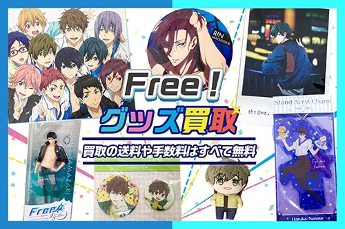 Free!シリーズのアニメグッズを各種買取しております。缶バッジ、アクリルスタンド、スポーツタオル、ラッシュガード、クリアファイル、劇場版の入場者特典グッズ、おまんじゅうにぎにぎマスコット、ポストカードなどFree!グッズをお売りいただけます。好きなキャラのみのグッズの買取や同一グッズの買取も大歓迎です!