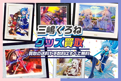 この素晴らしい世界に祝福を!をはじめとしたラノベなどの挿絵を担当しているイラストレーター、「三嶋くろね」のグッズを強化買取中!版画や複製原画、抱き枕カバーやタペストリーなど買取いたします。また、アニメ化したこのすばやロクでなし魔術講師と禁忌教典のグッズやフィギュなども買取します。