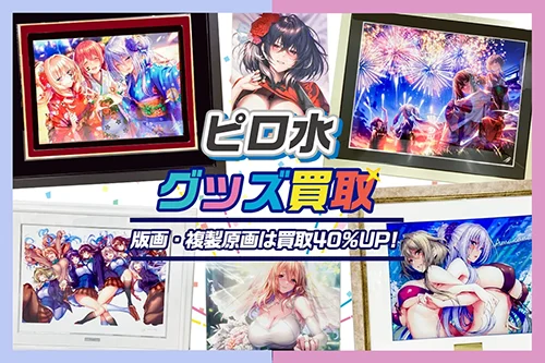 アマカノやデレマスの高垣楓さんの同人アイテムなどで知られるイラストレーターのピロ水氏。蠱惑的な表情のイラストを描かせたらトップクラスです。そんなピロ水氏の版画・複製原画を超強化買取中です。アールビバン・アールジュネスから出ている版画や絵師100人展の複製原画を買取いたします。版画や複製原画は箱がない、保証書がないものでも買取可能です。クラリティアートの買取もお待ちしております。今なら期間限定でピロ水氏の複製原画や版画の買取40%UP中!他にもメタライズアートやキャラファイングラフの買取も受け付けております。ピロ水先生以外のアールビバン版画や複製原画の買取も大歓迎です。
