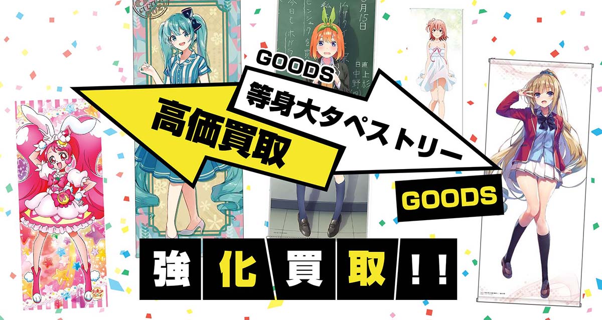 等身大のタペストリーの買取を強化中!アニメからゲーム、エロゲまで各種作品の等身大タペストリーを買取します。イベントやコミケ限定の等身大タペストリーの買取も大歓迎です。最新の作品から古い作品の等身大タペストリーも買取可能です。