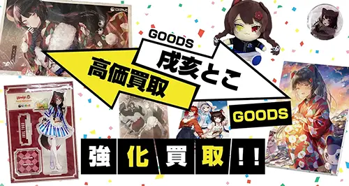 和風メイドが特徴的なにじさんじのケルベロスのケモ娘Vtuber「戌亥とこ」のグッズを買取いたします。東京タワーくじの景品グッズ、アクリルキーホルダー&ブロマイド、ウェンディーズコラボのタペストリーやアクスタ、DMMスクラッチくじのグッズ、缶バッジ、ラバーマットなど各種戌亥とこグッズを買取します。他にも、リゼとアンジュとのさんばかグッズや、誕生日記念グッズの買取もお待ちしております。