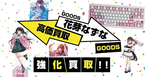 ぶいすぽっ!の花芽なずなグッズを買取いたします。アクリルスタンド、誕生日記念グッズ、周年記念グッズ、タペストリー、缶バッジ、ポストカード、VSPO GEARゲーミングキーボードなど各種グッズを買取いたします。ぶいすぽっ!全体のグッズやLVGグッズ、コラボグッズの買取も大歓迎です!