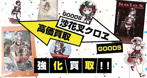 沙花叉の記念グッズを各種買取いたします。誕生日記念グッズや活動周年記念グッズ、100万人達成記念グッズなどを買取します。フルセットのグッズの買取から一部のグッズのみの買取も大歓迎です!また、フルセットの特典のポストカードの買取もお待ちしております。
