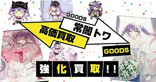 トワ様の記念グッズを各種買取いたします。誕生日記念グッズ、活動周年グッズ、登録者数記念グッズ、3D化記念グッズなどのグッズをお売りいただけます。グッズのフルセットの買取はもちろん、一部の記念グッズの買取のみや特典のポストカードの買取も大歓迎です。