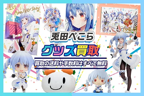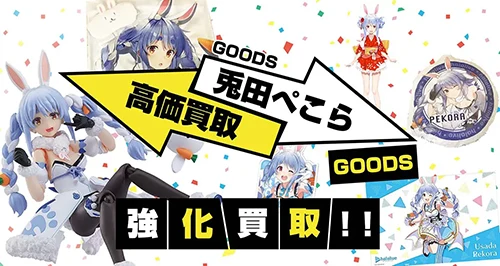 ホロライブ3期生のぺこーらこと兎田ぺこらのグッズを各種買取いたします。イラストレーター憂姫はぐれがキャラクターデザインしており特徴的なマロ眉やバニーガールの衣装で特徴的な笑い方でゲーム実況をよく配信している兎田ぺこら。そんな兎田ぺこらのアクリルすランドフィギュア、タペストリー、抱き枕カバー、缶バッジなどのグッズを買取いたします。他には誕生日記念グッズや他記念グッズの買取も大歓迎!他にはコミケやホロライブオンリーイベント限定のグッズの買取も大歓迎!